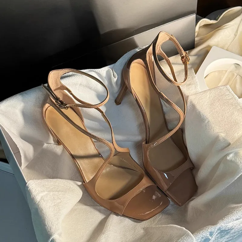 Fashion Patent Leather Peep toe Women Gladiator Sandals Sexy Narrow band Ankle Strap Gold Stiletto High heels Summer Party Shoes